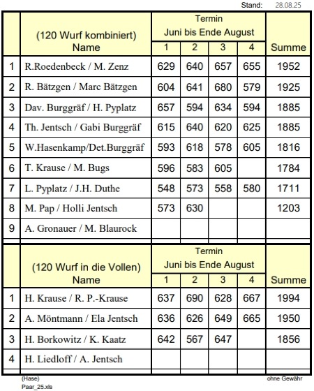 Die Paarungen wurden diesmal auf Grund einer Rangliste, ausgehend von den Ergebnissen zwischen Sept 24 und Mai 25, ähnlich der Vorgaben für den Vereinspokal, zusammengestellt, wobei der Beste mit dem Letzten usw. spielt. Allen Teilnehmern "GUT HOLZ "!