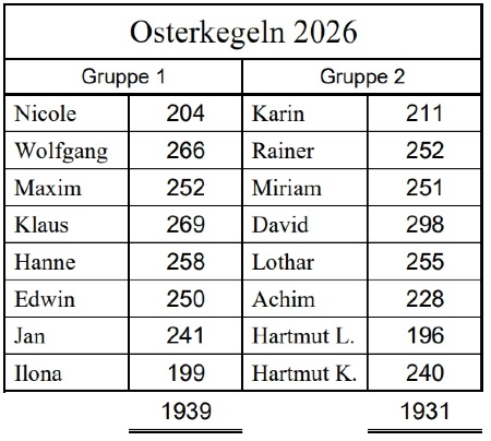 Vom 14.03.26 bis zum 12.04.26 war die Keglervereinigung Ausrichter der Rheinlandmeisterschaften, bei der man sich für die Westdeutsche Meisterschaft im Mai in Kamp-Lintfort qualifizieren konnte. Zwei Wülfrathern gelang dies, jeweils mit einem 2. Platz in der entsprechenden Disziplin, Klaus Lang mit 722 Holz bei den Herren-C und Thotty Jentsch bei den Herren-A mit 768 Holz