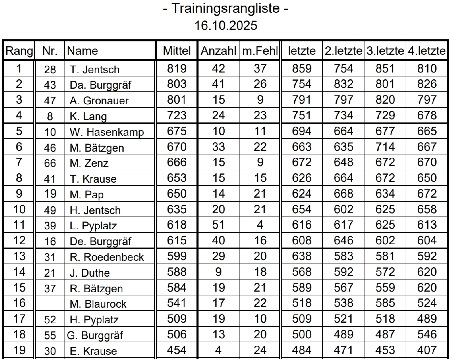Trainingsergebnisse - Rangliste und Rekordzahlen