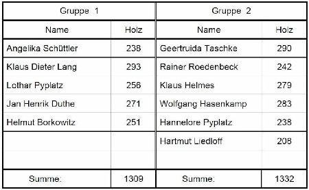 Jugend: Herren: 1. Platz 262 Holz David 1. Platz 300 Holz K-D. Lang 2. " 259 Holz Marc 2. " 267 " J.-H. Duthe 3. " 215 Holz Sven 3. " 235 " R. Bätzgen 4. " 200 Holz Simon 4. " 233 " H. Liedloff